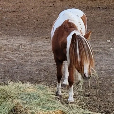 Flea came to us in March of 2021. She was owned by a fantastic lady from the time she was only 6 months old, but in 2021 she foundered. It broke her owner’s heart to give her up but she knew she was unable to care for her medical needs properly. Rhonda was already her farrier so she contacted us about taking Flea into the sanctuary program. As she now has specific medical needs she fits right into our program. Once she arrived we learned from our vet that she is partially blind. We have found this seems to be relatively common amongst minis. She does very well in the pasture, however, and sticks close to Thor, an ancient Fjord. She loves attention and pets but we have to remember to speak to her at all times so that she knows where we are and doesn’t get startled.